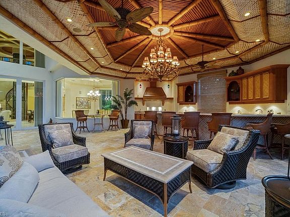 CASA DEL SOL perfectly named for this magnificent estate home that is filled with natural sunlight throughout!Fantastic boating waters await you as you cast off from your 65 ft. floating concrete dock w/direct access to the Gulf of Mexico.5 bedrooms,5 ½ baths,6674 sq. ft.Stunning architectural features,superb craftsmanship,special finishes,FURNISHED!Jerusalem marble driveway & lanai.Main living has 24ft.ceilings.Open concept & custom 12 ft. impact sliders pocket back allowing seamless entertaining from inside spilling onto the expansive lanai w/full outdoor kitchen.Exquisite bamboo ceiling,spacious seating area all under roof.Lanai extends onto the negative edge pool deck w/waterfall,unique fire feature.Back inside on your 1st floor,a chef's dream kitchen offering a 6 burner gas stove,high end appl.,crackled finished custom cabinets.Oversized master suite,bath & dbl tiered custom walk in closet.Formal dining.Separate guest cottage w/bath & efficiency kitchen.Take the circular staircase or private elevator to the 2nd floor to find 3 master suites all w/ensuite full baths.Theatre room w/bar,a recreation room w/billiards,an exquisite office space.Whole house gen.3 car gar.WATCH VIDEO!