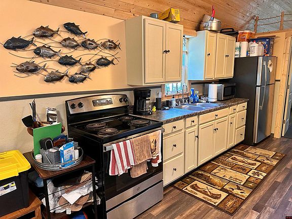 Adorable 1 bedroom/1 bath cabin sitting on .81 of an acre m/l on Hwy 5 South with a circle drive, all electric appliances, fire pit area. Covered front porch, small open deck in back off the bedroom; metal roof. Built in 2020. Used as a vacation cabin. Less than 10 miles to lake access at Tracy Ferry Marina. NEXT internet!