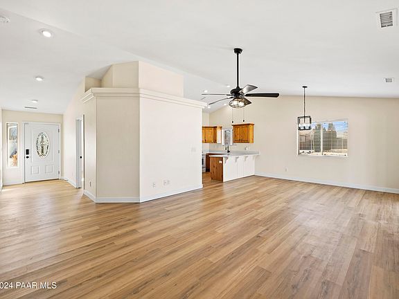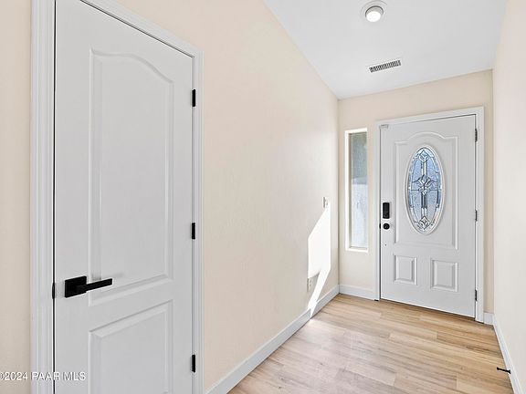 Have you dreamt about owning an incredible remodeled home in Prescott Valley with solar and no HOA? Well here is your chance! Incredible move in ready single level 3-bedroom 2-bathroom home on a corner lot centrally located, yet off the beaten path. New roof installed in 2020. Spacious great room with vaulted ceilings and luxury vinyl plank floors. The kitchen features distressed alder wood cabinets, quartz countertops, a gas stove, and a big farmhouse sink. The split floorplan primary bedroom has a large walk-in closet, double sinks w/matching quartz countertops, and a large walk-in shower too! This beautiful updated home will not be available long, swing on by and take a look today!