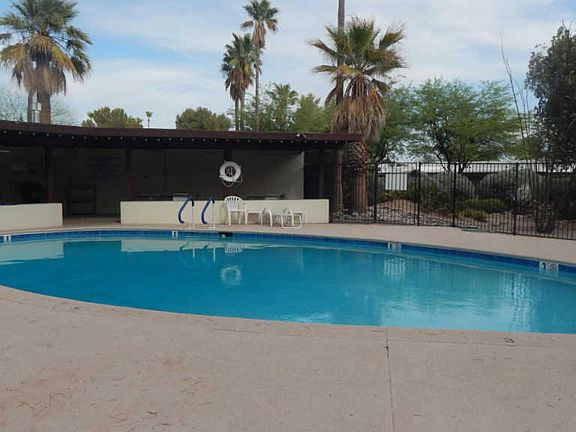 Enter into this Bright and Spacious Townhouse. Freshly painted in all neutral colors. Kitchen features lots of cabinets, granite counter-tops and eat in area by window. Open dining room-great room plan. Beautiful Beehive Gas Fireplace. 3 Large Bedrooms or Two bedrooms plus office space (closet has built ins). There is lots of natural light in this property. Lots of storage space. Washer and dryer included. Front porch entryway is screened in and back patio area is set up as AZ Room and a storage room also. 2 Car carport with storage rooms that run full width of carport. Gorgeous desert surrounding with walkways intertwined throughout the community. Community pool is heated March thru December. This home is close to all major amenities. HOA covers Water & Trash.