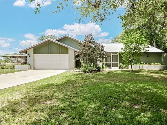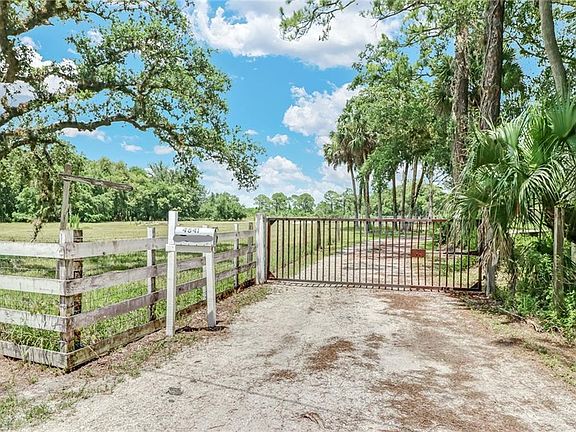 This property is a must see!! A peaceful, double gated, tree-lined entrance to a private 5 acre property fully fenced with a 1/4 acre pond and mature oak trees. The possibilities are endless with this farm house property. On the property you have a fantastic out building with electricity and water ready for a workshop or whatever you wish it to be. The home features an updated kitchen with beautiful granite countertops that opens up to the living room that has a large stone fireplace, with a wood beam vaulted ceiling. Sliding glass doors from both livings rooms, kitchen, 2nd bedroom and master bedroom give you access to a large under-truss lanai area to enjoy the pool. Newer metal roof and huge inside laundry room. Schedule your private showing today this property won't last long.