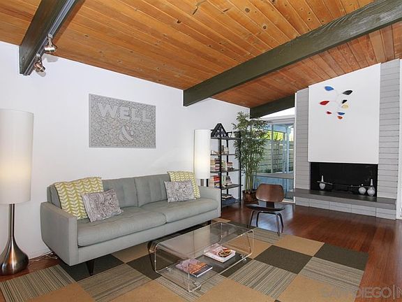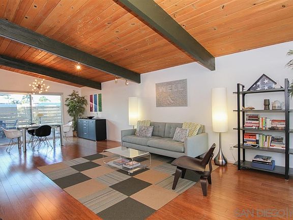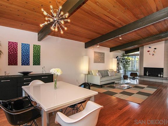 Renovated Mid-Century Modern Drogin home! Bright open floor plan w/vaulted ceilings, huge contemporary kitchen w/tons of storage & beautifully tiled baths! Family friendly cul de sac, yet just a quick bike ride to Bay Park shops, restaurants, tennis club+ upcoming trolley stop! Mid Century styling w/modern conveniences such as frosted tempered glass garage door, bamboo hardwood floors, aluminum dual-paned windows & sliders, central AC & laundry room. Back deck & yard are perfect for outdoor entertaining!