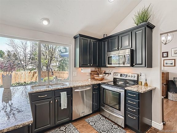 Gorgeous home in coveted Hyland Greens! This stunning home boasts an open floor plan, vaulted ceilings and newly upgraded kitchen plus a huge private lot where you will enjoy both sunrises and sunsets! Formal dining and living room plus inviting family room with abundant natural light and beautiful brick fireplace! The private guest suite is nicely separated from the spacious primary bedroom and secondary bedrooms on the upper floor. The primary bedroom boasts an en-suite bath plus an ample walk-in closet with built-ins. So many upgrades! New hardwoods plus luxury vinyl flooring throughout. New counter-depth fridge. New elegant lighting fixtures! Beautiful new 400 sf composite deck with 25 year warranty! All closets have custom shelving. New ceiling fans. Wood Levolor blinds throughout. New paint throughout! New W/D included. All new LED 13-year lifetime lighting throughout. Newer water heater. Newer fence. Beautiful raised gardens and strawberry patch! Rose gardens, lilacs, spearmint! All backyard lighting, deck trellises and outdoor potted plants in yard are included! Radon mitigation system added. Sauna in basement. Garage has finished coated flooring. Don't forget to check out the side driveway and camper entrance! Additional pad on the side is perfect for a shed or potting bench! Don't miss this opportunity to live in Westminster's best neighborhood! Hyland Greens is a golf course community with two pools, tennis courts, walking trails, parks including a residents-only toddler playground and countless HOA-sponsored community events such as concerts, food trucks nights, July 4th celebration, and an end of summer dog day at the pool! Don't miss this great neighborhood and great location! Just a quick drive to downtown Denver or Boulder!