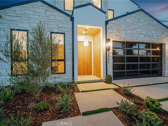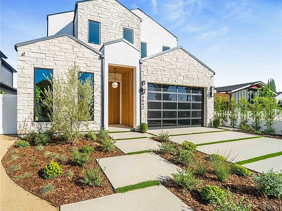 Custom, new transitional home with modern touches on a gated lot in prime Valley Village. Featuring 5 BR – 6.5 BA and dining room in home and detached rec room in approx. 3,400 sqft, with an open floorplan and extensive woodwork throughout. Bright family room features fireplace with stone accent wall and sliding glass doors to patio. Gourmet kitchen features custom white oak cabinetry, stainless steel appliances, Taj Mahal quartzite counters, and center island with bar seating. Spacious backyard features large turf area, detached rec room with ¾ bath, pool/spa, and BBQ area with bar seating. Primary suite features electric fireplace, white oak built-ins, closet with accent lighting, spacious primary bath with custom Taj Mahal tilework, and balcony. Home is completed by entertainer/designer details such as custom cedar wood ceiling design, patio/garden area, designer landscaping, surround sound speakers, security system with alarm/cameras, and Control 4 smart system.