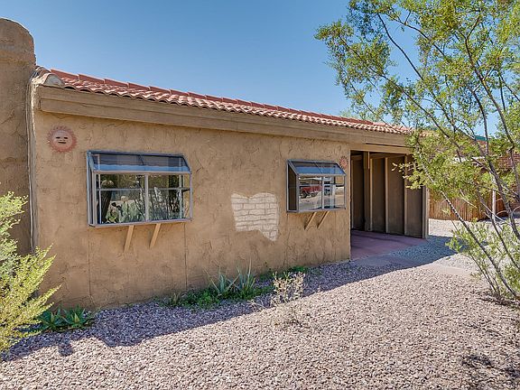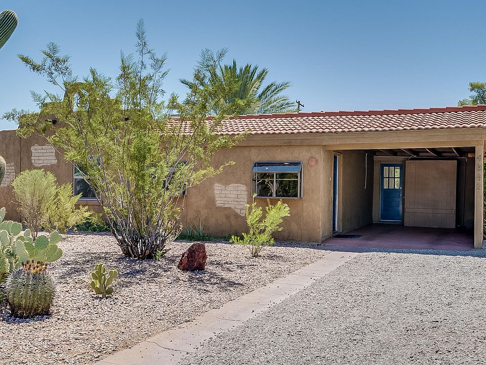Charming Santa Fe style home in nice, quiet central neighborhood. Features two bedrooms and two baths, master suite with large walk-in-closet, updated kitchen with granite counter tops and stove with ceramic cook top. Living room has a gorgeous beamed ceiling and gas fireplace. Beautiful concrete overlay floor is functional and easy to maintain.You'll save money on energy-efficient dual-pane windows and water with new rain-harvesting system. Other features include built-in microwave/vent, dishwasher, and brand new water heater. This home also has spacious carport with storage and extra parking. The very private backyard is fenced with large covered patio perfect for entertaining. Just walking distance from shopping and restaurants makes this central home convenient and a great value.