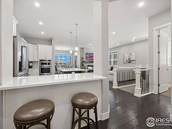Welcome to 4843 Mariana Hills Circle; this certified energy efficient, 4 bedroom/4 bathroom 2018-built stunner, w/ only TWO steps from the garage to the main floor, is an entertainer's dream and offers a rare multi-generational layout with a walk-out basement that houses a private guest suite, wet bar, and two oversized rooms, all within the heart of the Mariana Butte Golf Community, located at the gateway to world renowned Rocky Mountain National Park where the elk roam free through the neighborhood. NO METRO TAX! Enjoy the views of the butte from your dining room with 10' ceilings, dual-sided indoor/outdoor fireplace, engineered hardwood floors, and gourmet kitchen with KitchenAid appliances, induction range (gas line ready), slow-close cabinetry, and a full walk-in pantry. The luxurious primary suite offers a spa-like bath with dual rain shower heads, penny tile flooring, and custom walk-in closet with access to the laundry room. Outdoor upgrades include a courtyard, multi-zone sprinkler and drip system, and HOA-maintained greenbelt behind. This home truly has it all-for those who love nature & golf; just minutes from downtown Loveland's charming shops and dining, this is lifestyle and location in one unbeatable package!