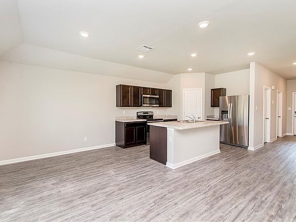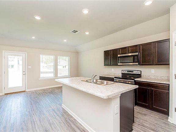 The open concept floor plan features a modern kitchen with stainless appliances and an island that faces the living room. Hard surface flooring throughout the foyer, living room, and kitchen. The primary suite is split from the other two bedrooms and features a double vanity, walk in closet, large soaking tub and shower combo. There is storage under the carport. Neighborhood park and playground. HOA fees are $300 per year.
