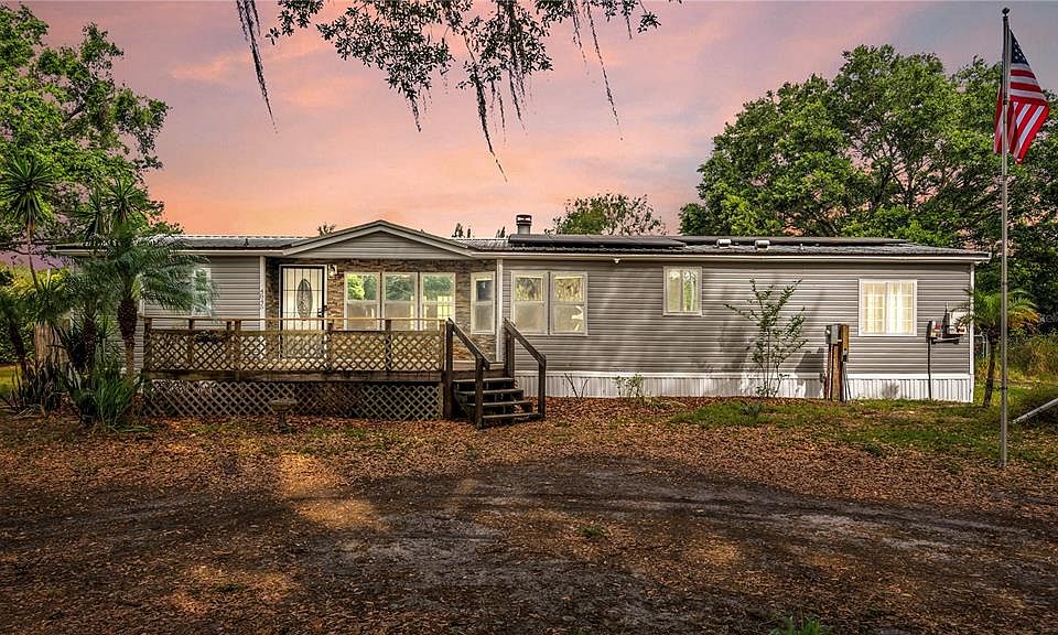 *SUBMIT BEST AND HIGHEST OFFERS BY 4/1/23 at 6 pm.* This Palm Harbor mobile home in North Lakeland, sitting on almost an acre of land, is the perfect place to call home. With no HOA to worry about, you'll have the freedom to customize and enjoy your property as you see fit. Immediately upon entering the property you will find a 22x25 detached two car garage with three 8 foot doors, a wood deck, new siding and skirting, new double pane windows, and a solar paneled roof that is paid off free and clear. Once entering the home, you will be greeted by a spacious family room and an additional living room/den with a see-through fireplace in between both rooms. To the left of the family room is the Master Bedroom featuring a large garden tub in the bathroom. The eat-in kitchen features oak cabinets, a kettle faucet, galaxy granite counters, a breakfast nook, and a bar. Down the hall from the kitchen, you will find two additional bedrooms and a laundry area. Outside, you will step onto the covered deck that has been newly stained with a heated above ground pool. In the backyard you will find a 12x24 shed perfect for storage, a new sump pump, and a new water softener system. This space is ideal for anyone with outdoor toys, a garden, or animals! This peaceful property has lots to offer, and only minutes away from shopping and I4 access! Call today for a private showing.