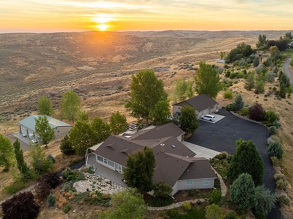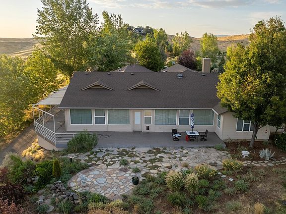 Ten acre hill-top view lot in Eagle foothills, surrounded by trees, vineyards, and wildlife. Well-maintained 3 bed 2½ bath 3,052 sf home with 360 views of the valley and mountains from expansive deck. Spacious remodeled kitchen and south-facing sun room. Guest house includes fully amenitized media room, garage, bedroom, full bath, & kitchen. Nine-car garage/barn with shop. Garden beds for planting, & space for kids and animals to roam. Large primary suite boasts a walk in closet, dbl vanities, jetted Kohler cast iron tub & heated tiled floors. The great room includes an updated tiled fireplace w/ access to the deck, formal living & dining areas allow room for entertaining. Heated/cooled shop that also includes heavy duty wiring, 7 - 220V circuits, air compressor lines throughout, 88 drawers for tools & 47' of counter space. * Instant hot water in kitchen and master bath.