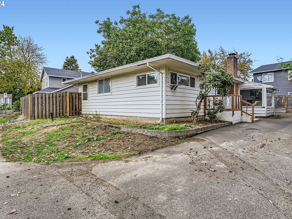 Classic 1950s Extra Spacious 2 Bed/1Bath Ranch Home. Every room in this home is super sized. Sizable living room has an attached sunroom alcove and wood burning fireplace. Roomy eat-in kitchen. The primary has wall to wall carpet and a large walk-in closet. Second bedroom has a nook space for an office and has access to the backyard. Extra storage in an enclosed breezeway connects the Laundry Room and Converted Garage. Garage is currently used as a bonus room with built-in bar that could be easily converted into a 3rd bedroom. .18 Acre boasts a large driveway with room for RV parking and a shed for additional storage. Fully fenced home in a secluded area with plenty of privacy.