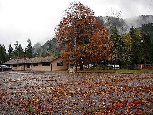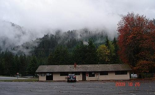 Huge parking lot great views out the front windows of mountains and trees. The trees hide the nearby river.