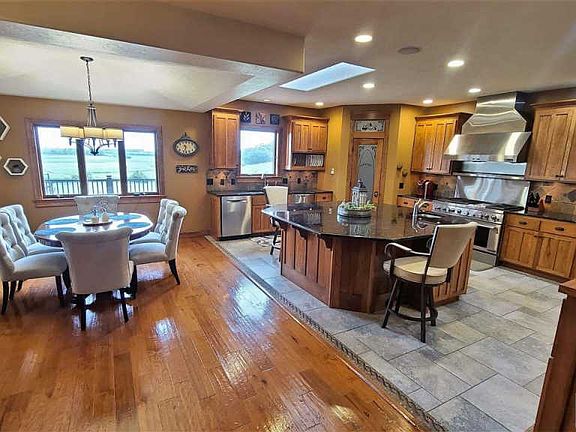 Custom Built Ranch home on 9.6 Acres with scenic country views and additional detached 40x30 heated/finished garage/shop with core floor. Open floor plan boast gourmet kitchen featuring W/I pantry, granite counters, huge center island, high end Stainless Steel appliances, heated tile floor. Large formal dining room off kitchen. Hardwood flrs throughout the main flr into open living rm with wood-burning FP. Off living area is access to amazing 3-season rm w/ heat&AC, perfect for relaxing or enjoying a meal with gorgeous views of the countryside. Main floor hosts 3 beds, featuring a luxurious mstr ste w/his & hers W/I closets & access to the 3-seas porch. Master bath boasts, dual vanity, tile W/I shower, whirlpool tub, & heated tile flr. Desirable MF floor laundry/drop zone. LL features large family room, Beautiful office w/ built-ins, Professional theater w/tiered seats, wine cellar, full wet bar w/granite. LL also includes game/craft room, full bath & half bath, 4th/5th beds. Must see.