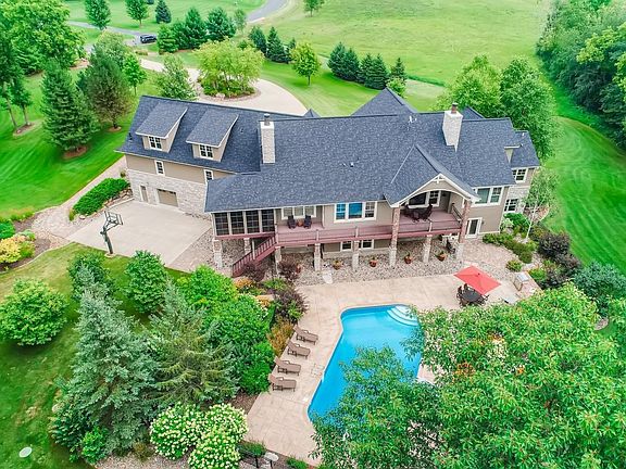 No box left unchecked! This 4 bed, 4 bath custom built, river front, walkout rambler on 3+ acres features a classic stately front, circular cement drive & manicured grounds. Tons of built-ins and cherry/enameled woodwork throughout. 4 fireplaces, 2 laundry rooms & infloor heat. Kitchen & dining includes huge center island, granite counter tops, tile backsplash, double ovens, JennAir appliances, built-in buffet & walks out to maintenance free deck on either side. Sunroom leads to three season porch with EzeBreeze windows. Main level master with spa-like suite. Lower level family room walks out to pool area. Wet bar for entertaining. Exercise room with Murphy bed. In-ground heated salt water pool with spacious pool decking, diving board & slide. Outdoor grill station with granite counter top, fridge & stone fireplace. Geothermal, finished heated garages with floor drains & bonus room above. Lower level garage opens up to basketball court. More land available. See supplements.