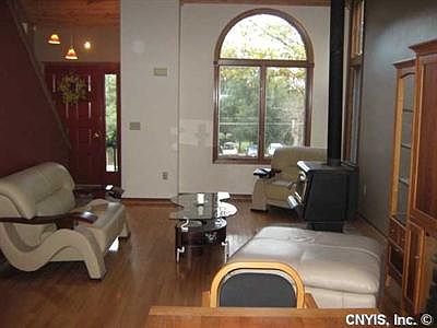 This amazing 2,009 sq ft contemporary sits on beautiful treed 1 acre lot. Home features 4 bedrooms 2 full baths, living room with wood burning stove for the cold winter days, dining room with sliders to back yard, fully equipped eat-in kitchen, family room with pellet stove, first floor master bedroom with bath. Beautiful hardwoods throughout this home. Many updates new roof, all new kitchen appliances, new pellet stove, pine ceiling's, loft addition and so much more! Out building 24x16 2 story with electric. Marcellus schools! Public water & gas. Welcome Home!