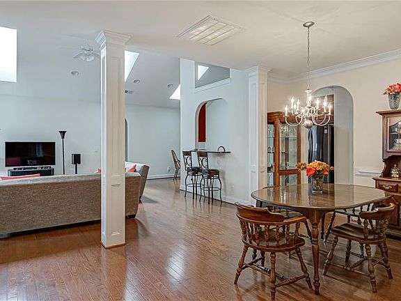 Nestled in ultra convenient townhome community (with no thru traffic)--this one level end unit features sun drenched rooms provided by windows and skylights; gleaming hardwood floors in main living area; immaculate condition throughout with neutral interior; granite countertops in kitchen with warm wood cabinets, tumbled marble backsplash & newer black stainless appliances; double sided gas log fireplace in living and sun room; carpet in bedrooms; split bedroom plan; large updated shower & walk-in closet in primary suite. Also, attached 2-car garage and private brick walled patio (12 x 19) with gate to grassed/wooded common area. NO STEPS