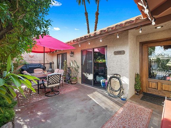 Located in South Palm Desert in the exclusive Palm Desert Tennis Club. This immaculate and upgraded single level 3 bedroom 2 bath condo is the perfect place to relax and enjoy all that the Desert has to offer! As you enter through your spacious private patio you are greeted with beautiful potted plants and custom wrought iron gates. Inside, the open concept living space features high ceilings, brick fireplace, outdoor patio access, a wet bar, new interior paint, and new recessed LED lighting. The kitchen has new stainless steel appliances and upgraded soft close kitchen cabinets with front courtyard patio access. The primary bedroom is located opposite the guest bedrooms and boasts private patio access, high ceilings, and recently renovated bathroom. All bedrooms are of good size and feature a sliding door to private outdoor space. Out back, enjoy stunning west facing mountain views under your covered patio. Other features include, newer A/C less than 3 years old, new baseboards and newly re-stained front and backyard patios. HOA includes 6 swimming pools, 5 spas, eight lighted championship tennis courts and on-site tennis pro and tennis coordinator during the season and social membership, pickleball, squash, bocce ball, and clubhouse. Where luxury meets cozy, this home has too many upgrades to list and is a must see!