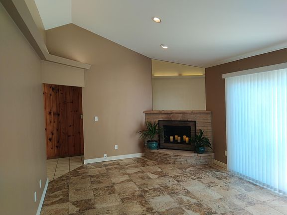 Private and spacious 2+1 single family home on large multi family property. Great floor plan with country style pine wood kitchen and dinning area. Spacious living room with faux flagstone fireplace, cathedral ceiling and cove lighting. Large sliding door leads to a private sunny patio and backyard. 2 generous sized bedrooms each with floor to ceiling closets and storage cabinets. Bathroom has plenty of storage with classic vintage style blue sink and tub.Tile floors throughout with all door and window coverings. Attached garage with complete laundry hookups. Central heat and air. This warm and comfortable home is a must see! Opportunity to share all utilities
