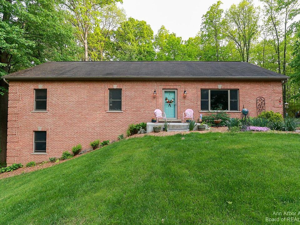 This lovely 4 bed/2 bath open floor plan brick ranch with 9' ceilings, is nestled in the woods on almost 3 acres of old growth trees. Where trilliums cover the ground in the spring, and deer, turkey, owls and songbirds visit daily. Built only 20 years ago, this serene sanctuary is only 5 miles from local shopping, yet it feels like you're up North. The sun-filled, open floor plan, boasts a number of recent updates, including gorgeous Michigan hardwood flooring throughout (carpeted bedrooms); all new appliances, kitchen & washer/dryer. The main floor bathroom has recent upgrades including flooring, counters/sinks, faucets and lighting. Also has a new water softener, water heater, new trim throughout, updated electrical outlets/switches, fresh neutral paint throughout, a stylish barn door an and newly laid gravel on the scenic driveway. A large deck is right outside of the sliding glass doors, overlooking the fire-pit and hammock, where you can spend the evenings stargazing while listening to the owls. The full-walkout basement, with almost 10' ceilings, is complete with a wood burning stove, making it a cozy haven for all seasons. It is partially finished with lots of potential, Rec Room: Partially Finished, Rec Room: Finished