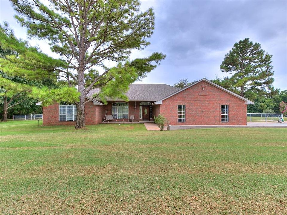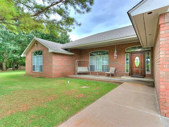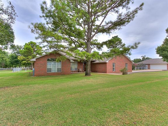 New interior & exterior paint throughout! Welcome to this wonderful 1-owner custom home in the heart of Noble. Situated on 5 beautiful acres with a detached garage that is bricked to match the home as well as a large shop. When you enter the home you are greeted by a large living area with great natural light. Off the living room is a dining room and kitchen with solid surface countertops and an oversized pantry. The home features a large media room perfect for a second living, office or movie room. On one side you'll find the 3 spare bedrooms, a full bathroom and a half bath as well as the large laundry room off of the attached garage. The large primary suite is located on the other side of the home providing a lot of privacy. The en-suite includes his & her closets, a soaking tub and shower. There is no shortage of storage in this home with multiple walk-in linen closets, built-in storage in all 3 spare bedrooms and built-ins in the laundry room. Enjoy the oversized covered patio where the slab has been reinforced giving you the ability to add an additional 20x20 room if desired. All 5 acres are fenced with a separate fenced area off the back patio with 14 zones of irrigation using well water. The detached garage has 2 overhead electric doors, perfect to store lawn equipment and additional vehicles. This property also features a 40x60 insulated and heated shop which includes a hydraulic car lift, overhead bridge crane, 3 overhead doors, a half bath and a cellar built in 1914 that can be used as a storm shelter. Home is on city water but has a private well used for irrigation. Additional upgrades include new roof 2024, new carpet in spare rooms, new AC unit 2020 and generator. See supplements for full list of upgrades.