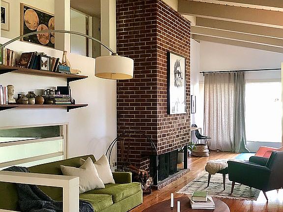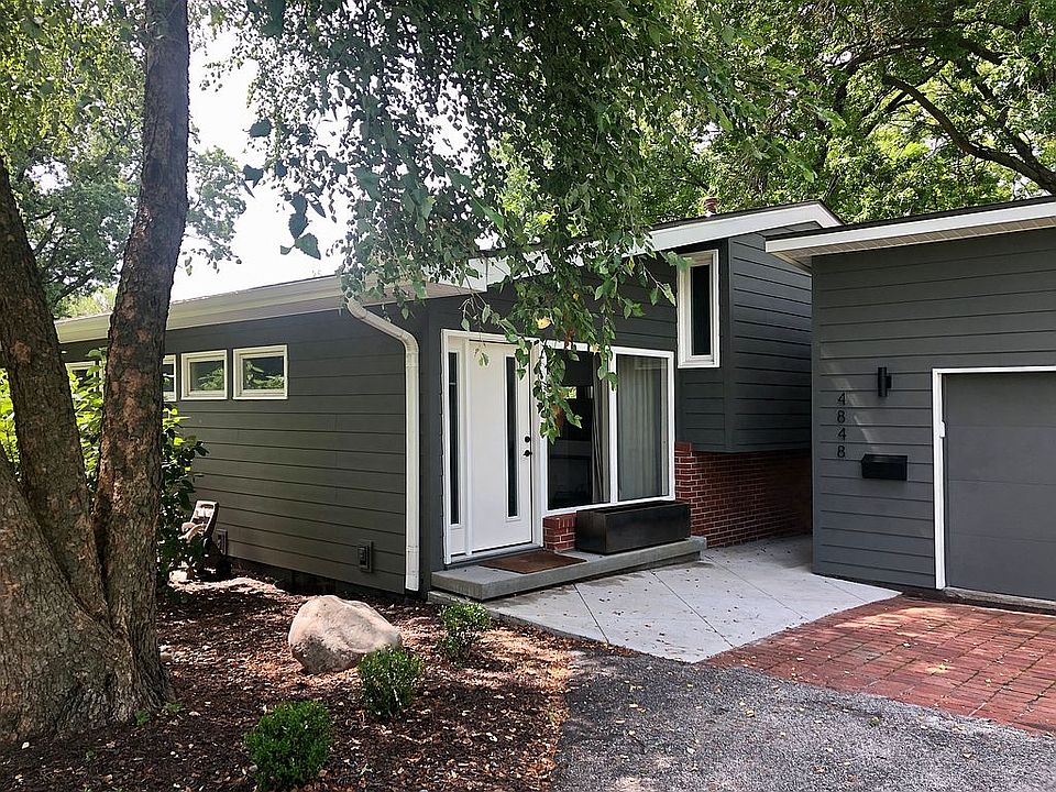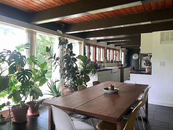 Mid-century modern split-level ranch with large windows, fireplace, hardwood floors, vaulted ceilings and lots of modern updates. Open floor plan kitchen and living room, walks out to entertaining patio. Library/office, detached 2-car garage, large deck and patio, and wooded 1-acre lot.