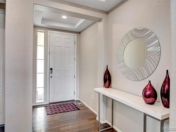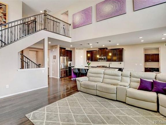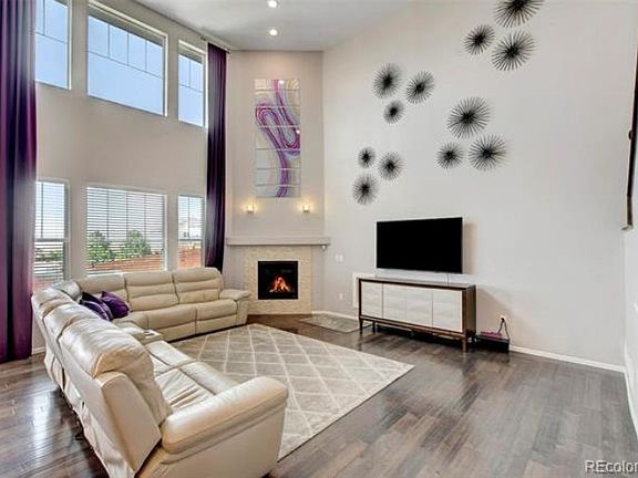 You must come see this absolute gem located on the largest lot in Copperleaf in the Cherry Creek school district with breathtaking Mountain View's from the covered TREX deck. This home is an entertainers dream with an open floor plan that gives you clean sight lines from the kitchen to the main living room that features cathedral style ceilings and a fireplace. Your main floor has a bedroom and full bath as well as a mud room with a bench and shoe storage space. There are 4 bedrooms upstairs with a large primary bedroom that has views of the mountains and electric shades. The 5 piece primary bath has a 2 walk in closets with custom closet organization systems. 2 of the guest bedrooms have a jack and Jill style full bathroom and the 4th is an en suite. There is also a dedicated furnace AC for the upstairs. The fully finished basement features a theatre room (or non conforming bedroom) and a wet bar to accompany the living space. The crown jewel is the backyard, everything was professionally done and incredibly well thought out. There is a large covered deck and concrete patio that you can get to enjoy sunsets over the mountains and enjoy the 4th of July fireworks shows throughout the metro area. There is also dog run space with synthetic turf and plenty of grass space to enjoy yard games. You'll also get peace of mind not having to install Christmas lights because the house is outfitted with custom Jelly Fish Lighting all controlled by your phone. There is a park 1 block away that has food trucks, music and movies in the summer. Don't wait to schedule your showing!