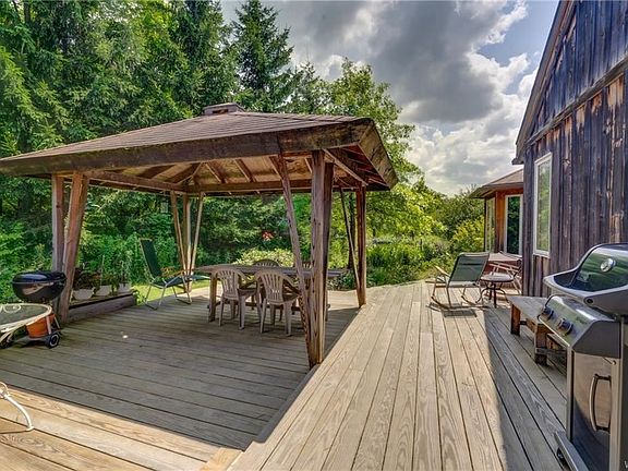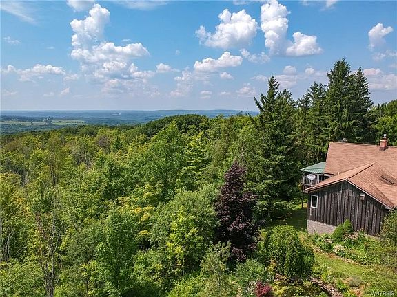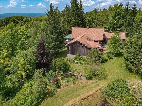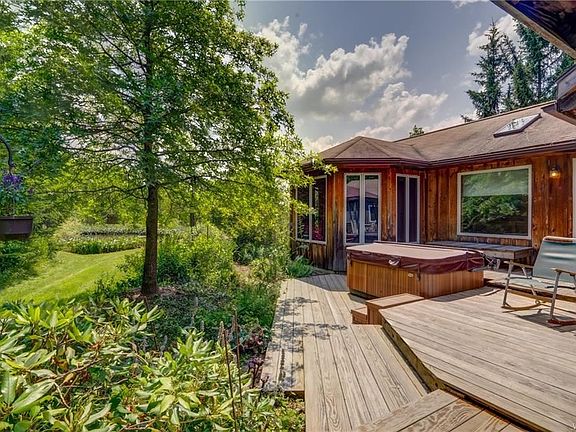 A secluded wooded setting makes this a perfect retreat to come home to every day! 5 Acres surround this 3 bedroom 2 bath home with a beautiful kitchen featuring custom built cherry cabinets & breakfast bar. The open living dining room feature cathedral ceilings, gas fireplace, sliding glass doors & windows to enjoy the outside views. A 29 ft. sun room adds living space and has a view for miles over the tree tops. Owners added a beautiful master suite to the home with private bath & walk in shower. A loft bedroom has wood floors & a cozy nook. The walk out basement is partially finished adding living space with great rec room & office area. The back deck with gazebo over looks the gardens & pond & the hot tub stays! Additional acreage is available. Central air, generator & home warranty