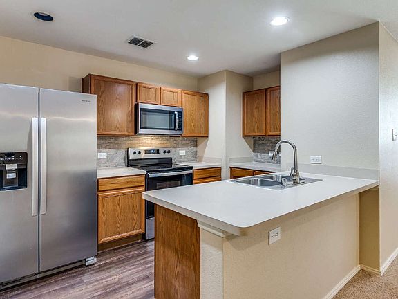 The kitchen offers wood-look vinyl plank flooring, tile backsplash, recessed lighting, stainless steel appliances, and a breakfast bar perfect for casual dining or entertaining. The large primary suite and secondary bedrooms include ceiling fans and ample closet space for comfort and functionality.