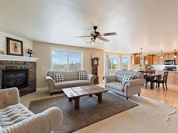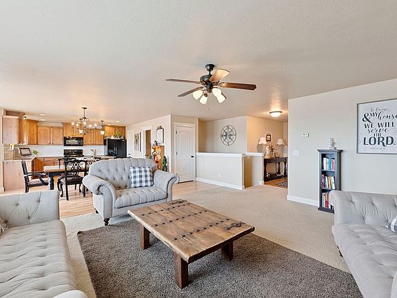 Great Location & neighborhood East of Sky View. Beautifully Landscaped, fenced with double gate. Apple trees, Raspberries, Blackberry bushes, & Japanese Maples. Garden area, raised beds, cute shed, outdoor fire pit & basketball hoop. Open concept entry/living/dining/kitchen. Granite throughout. New bathroom tile, Corner Fireplace. Huge pantry, large laundry, large family room. Walkout Basement with huge storage room & large cold storage under front porch. Large newly painted 2 car garage.