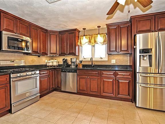 Beautifully renovated, majestic raised ranch, with gleaming hardwoods in kitchen, dining, hallway, and living areas. Renovated eat-in kitchen with custom cherry cabinetry, island, stainless steel appliances (including 2 convection ovens), and granite countertops. Semi-open floorplan to the living room and dining room, with option of closing french doors for privacy. Updated first-floor bath with beautiful tile shower and gorgeous double vanity. Dining room with sliders opens out to expansive deck; Imagine sipping your morning coffee overlooking your acres of land and gardens (3.3 acres in total). Finished downstairs provides access to 2-car garage, family room w/wetbar, projection system, Bose speakers, plus a private office area. Backyard is complete with gazebo (with electric service), fire pit, storage shed, enclosed vegetable garden area, above-ground pool, potting shed, and abundant perennial and bulb gardens. Central Vacuum, Central Air, and alarm system, too!