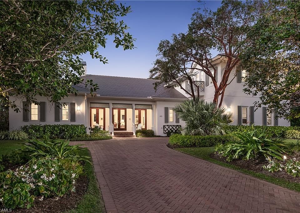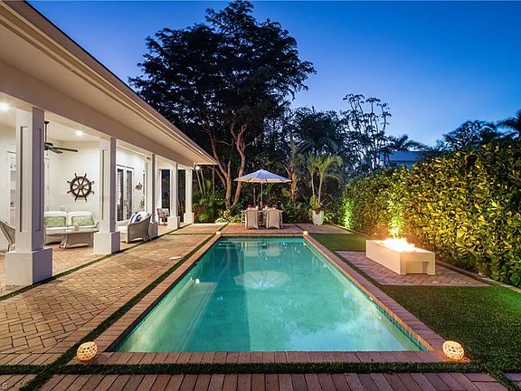 A sophisticated tropical retreat nestled in the heart of the Moorings neighborhood with updates/renovations 2019-2024. Exuding comfort and timeless elegance with a stunning vaulted ceiling Great Room featuring a Coral Stone fireplace. An updated kitchen with Thermador appliances including a 36 inch Induction cooktop, Quartzite counter tops, under counter lighting and custom cabinetry. Multiple French door draw you to a lushly landscaped outdoor area, which includes a covered lanai, heated pool, extended deck and an outdoor fire feature. Four spacious bedrooms, with an expansive and very private 1st floor primary suite with a gorgeous honed dolomite bath and large walk in closet. Additionally there is a first floor en-suite guest room plus two upstairs bedrooms with a nursery-office nook offering multiple family/guest spaces. Wide plank oak floors, crown molding, tremendous closet/ storage space, dry bar with walnut counter top and beverage refrigerator. Built in work center and 2024 cement tile roof. Come take a look at this very special offering. Private Moorings Beach Park is available to all homeowners but it is voluntary.