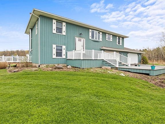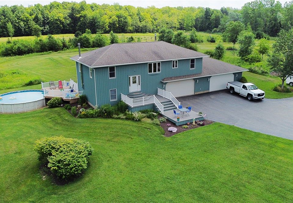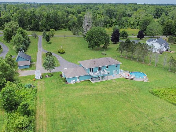 Welcome to your sanctuary! This home was custom-built by its only owner and sits on 3.8 acres, secluded from Whitney Road. The picturesque surroundings evoke a sense of peace and serenity, and inside, you'll find a recently updated kitchen designed for style, functionality, and entertaining. From the combined kitchen & living room, enjoy fresh air and sunshine through the sliding glass doors that open to your upper deck. The finished lower level includes a wood burning stove and is presently used as a TV lounge & guest bedroom with full bathroom. From the lower level, you can access the expansive partially shaded walk-out concrete patio. An above-ground pool and the multiple outdoor seating areas deck provide the perfect ambiance for guests. The attached four car garage offers convenience and organization, and the additional outbuilding could be used for storage or shop space. The private road leading into the development is legally shared by the five owners and will be repaved this year. Riding mower & subcompact tractor are negotiable. Showings start Wednesday 5/17 at noon; negotiations start 5/23 at 4PM!