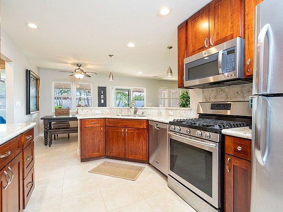 Naturally the kitchen has stainless-steel appliances, slab-granite counters in a white coral colorway. In addition, there is a separate laundry room with a second stainless-steel fridge.