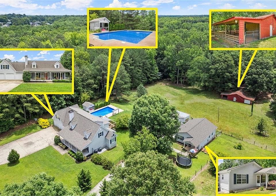 Unique opportunity for a dreamy homestead in Auburn, Northern Gwinnett County! There are 2 homesites on this 3.69 acre lot. The main house is the classic farmhouse you are dreaming of with the rocking chair front porch, large front yard and a pool out back overlooking the pasture area and a red barn. Inside you'll find a large family room, a kitchen with updated stainless steel appliances and granite counters and a large sunroom. The primary suite is also on the main level and offers a walk in closet, dual vanities in the bathroom and a whirlpool tub. Upstairs are 2 generous sized bedrooms as well as a large bonus room. The bonus room has been divided into 3 spaces- the larger room is currently being used as a media room. There are 2 additional rooms in the bonus room without closets. Outside in the backyard, the pool area is fenced and has a pool house with a half bathroom and storage for pool supplies and toys. Also on the property is an additional 1,148 square foot home with 3 bedrooms and 2 bathrooms- ideal for a multigenerational family or an income producing property. Between the two homes, you'll also find 7 garages! The car enthusiast will be thrilled! 3 garages are attached to the main house and a detached 4 car garage is situated by the 2nd home. It is the picturesque setting you've been hoping to find, and the location cannot be beat. Zoned for the beloved Mill Creek Highschool cluster and close to all of the shopping and dining options around Hamilton Mill. Convenient to I-85, Chateau Elan Winery, Mall of Georgia and Lake Lanier.