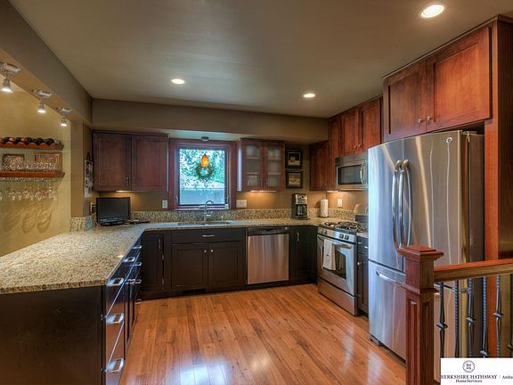 Pride of ownership shows in this IMMACULATE 4 bedroom multi-level! Large corner lot w/fenced yard & sprinkler system. Maintenance free vinyl siding. Unique open floor plan. Gorgeous luxury laminate flooring throughout the entire home. Updated kitchen with new cabinets, granite/ss appliances. Walk-out to patio from FR with deck above. Newer windows. LL partially finished. Extra parking pad on side of home. Great location close to Papio Trail, schools, and parks!