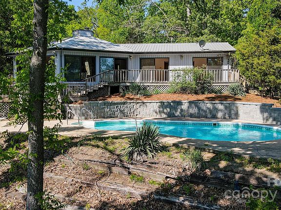 Located on a private 1.7 acre point lot with approximately 550’ of shoreline, beautiful hardwood trees, and AMAZING panoramic views of Lake Wylie. Designed to enjoy the outdoors and lake living this 1 level waterfront retreat features 3 bedrooms, 3 baths, vaulted ceiling, unfinished basement, and plenty of windows to enjoy the lake views. Can be enjoyed “as is” for weekend retreat or update when ready. You’ll love the wrap around deck, in ground swimming pool, and floating boat house that are perfect spots for outdoor entertaining or just to relax & take in the glorious main channel views. Home is currently on well and septic but York County sewer is located at the road. Owner receives free access to most Handsmill amenities at no cost. Clover schools, SC taxes, convenient to restaurants, and shopping.