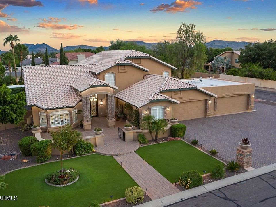 California-coastal style home w/ a stunning Phoenix backdrop, getting the best of both worlds. A gardener's dream- this unique home has a sustainable, raised bed garden w/ a wide array of fruit&vegetable gardening opportunities. The backyard is a stunning paradise w/ huge pool, ramada, full kitchen/bbq area, fireplace w/ built-in heaters on propane gas, & tropical fruit trees. Spacious 5 bed/4 full bath/den home, all completely remodeled. 2 master suites, up & down. Some upgrades include: built-in indoor entertainment center, front porch sitting area, remodeled kitchen & bar, & cabinetry. Lots of storage space & 4-car garage. Side yard has RV gate that can accommodate food trucks or even a wedding. Entertainer's dream come true. Private backyard gives you a resort-like feeling. MUST SEE!