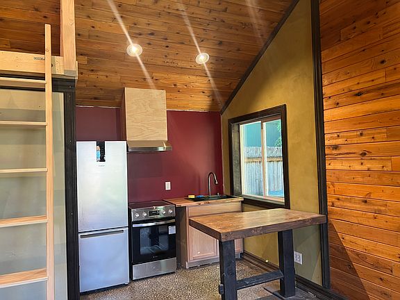Secluded, detached artist studio with lofted 14 ft ceilings in tranquil yard with private patio and utilities paid with a flat rate all year round. $1500 + $250 utilities (including high speed internet), $1750 a month. We're blocks from awesome restaurants on 42nd Ave, halfway between the Alberta Arts and Beaumont/Wilshire Districts, and right down the block from a beautiful park on a bike boulevard. Ten minutes to the Airport, right around the corner from public transportation, very convenient location! This studio was loving crafted with natural plaster walls, vaulted ceilings, and a gorgeous 6 foot bathtub with built in tiled shelves, stained wood finishes and unique artistic touches thoughout. The space is roomy and bright with a loft large enough for a king sized mattress (I have a new king sized bed and would love to provide if wanted), many big windows, a generous living room that flows effortlessly into an open dining space and full kitchen. This apartment is equipped with both recessed and hanging lights, all on dimmer switches to create the perfect atmosphere. Amenities include: ductless heating and cooling, closet and pantry space, counter-height table in dining area, brand new Tuft and Needle King sized mattress, brand new stove and sink, and an additional 4x16 ft covered exterior storage space. The back patio is surrounded by bamboo and the front entry has 14 foot tall rose bushes that get 100s of blooms in season. Pets are allowed if they are a good fit. I have one dog and 2 cats. I do not charge pet fees or deposits. An indoor cat is fine and a dog is fine as long as they get along with my dog Rose because they would be sharing the backyard space. 1 year lease, base rent is $1500 plus flat fee for all utilities is $250. Will allow 1 dog, regardless of size if compatible with my dog. Will allow indoor cat.