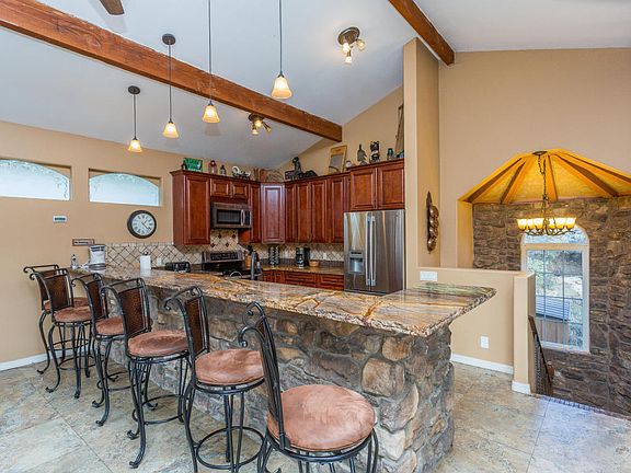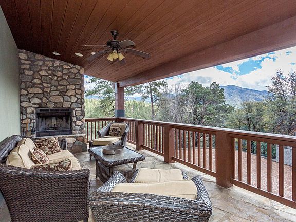 Boasting forever views across Prescott National Forest at near 6000ft elevation is this mountain chalet that has been COMPLETELY remodeled (2010). Featuring 4 inside fireplaces (3 with heatalators) and 3 outside FP, Granite and Marble Countertops,Cherry Cabinetry, new stainless steel appliances,Travertine and porcelin tile flooring.Oversized top deck w/hot tub and covered patio/deck area has FP and Gas BBQ. Jetted tub in Master. 4 Bedrooms, 4 1/2 Baths is perfect size for primary or second home. All new Trex decking and hardscape (2017) 10'x10' shed/shop with electric.