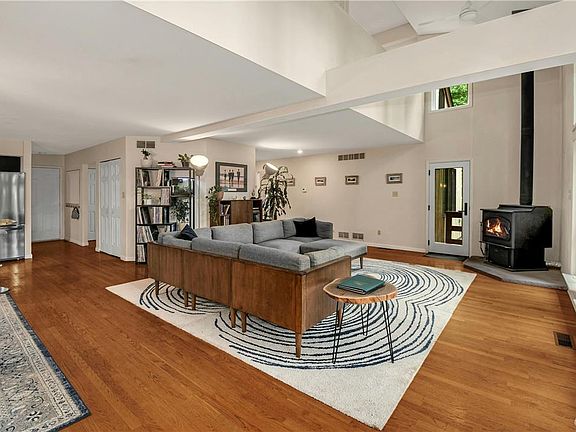 Oak floors, high ceilings, and abundant windows accent inviting living spaces. The heart of the main level is a large great room with a wall of windows and a wood stove for cozy evenings. The updated kitchen offers granite countertops, stainless appliances, and a separate pantry. With two bedrooms and a full bath located on this floor, the layout is flexible for a variety of needs. Flush with natural light, the second floor loft overlooks the great room and accesses a balcony overlooking the sun dappled yard. Located on this level, the primary suite features plush carpet and a vaulted ceiling with skylights. The luxurious private bath, remodeled in 2022, includes a radiant heated floor, dual sinks, glass wall shower and separate soaking tub. An additional full suite as well as attic storage complete the second floor. The finished walkout lower level functions beautifully for large or small gatherings. A covered deck and paver patio provide front row seats to visiting deer, songbirds, and the peaceful clucking of chickens from the coop on the lawn.
