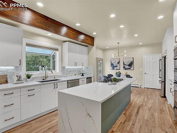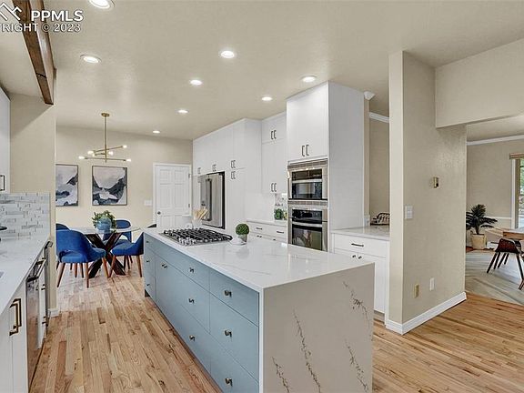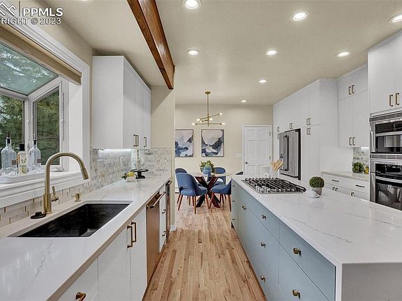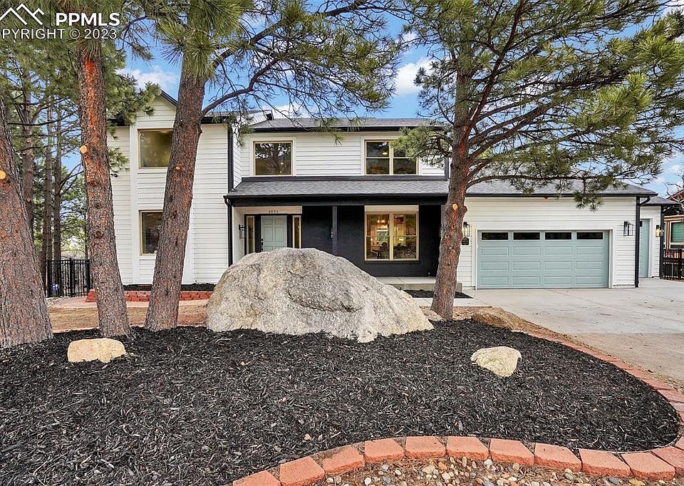This beautifully updated mountain modern home is located in upper Broadmoor Bluffs. This home will impress the moment you walk through the door. The entry way features wood floors, curved staircase, and new custom fabricated steel railings. The dinning room features a new haring bone tile rug with wood boarders, The new kitchen has custom frameless cabinets with tons of storage and under cabinet lighting, quartz countertop including a waterfall counter top on the kitchen Island, high end appliances including a new ice maker perfect for entertaining, and custom tile backsplash. The new family room was doubled in size and features a new wet bar with beverage center, gas fireplace, and two decks! The oversized master bedroom features vaulted ceilings, private deck, two walk in closets, and an HGTV worthy master bathroom that features an incredible wet room with Frank Loyd Wright fixtures that include a hydro powered rain head that lights up as water is running through it. The bathroom also features 48inch textured tile, stand alone tub, 3 shower heads, double floating vanities, and vaulted ceilings. The two additional large upper bedrooms are also feature vaulted ceilings and walk in closets. Every bathroom in the home has unique designer tile and quartz countertops. The new walk out basement recreation room was doubled in size and feature a gas fireplace with new tile surround. The home also features a huge new composite back deck with black metal railings and gas hookup. The large back yard has newer metal fencing and a newer greenhouse. The home has all new plumbing, new roof, exterior paint, and the windows were replaced with double hung windows about 5 years ago. The oversized 3 car garage also features new garage doors and a 9ft door. This is truly the turn key home you've been looking for!!