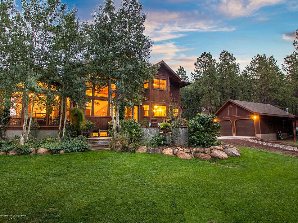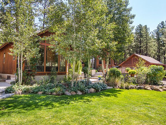 One of Flagstaffs most desirable neighborhoods in the Sechrist Elementary district. Rural living and only 10 minutes from downtown and the hospital, all on 2 acres.Upon entry you are greeted with a towering wall of windows and natural light in your 17ft vaulted living space with a wood burning stove. 3 level home w/ 4 bedrooms. loft and office. Master features its own sunroom that circulates the passive solar heat down to the lower level of living space. Step outside to your private hot tub after a full day of skiing. Walkout basement includes 2 bedrooms, 3/4 bath, family room, storage room, and game room w/wet bar. Garages for 4 cars plus additional covered carport. Well thought out use of passive solar and rain runoff for ease of watering the established landscaping. Upgraded kitchen wi