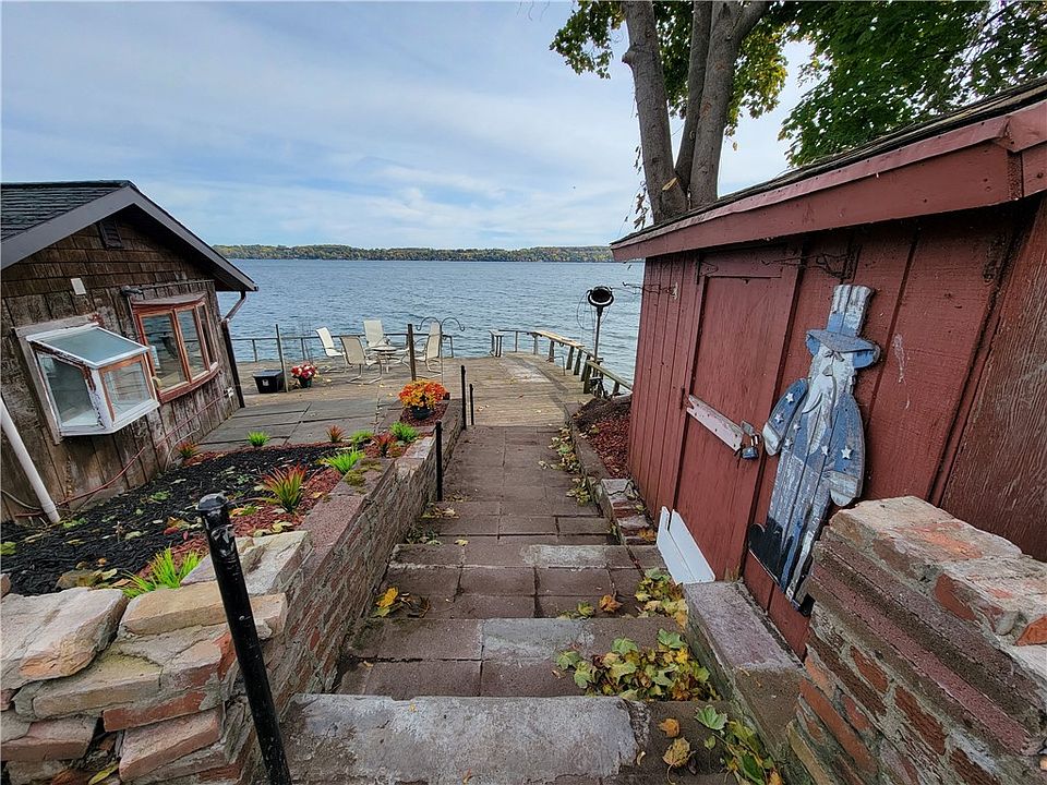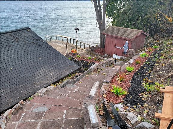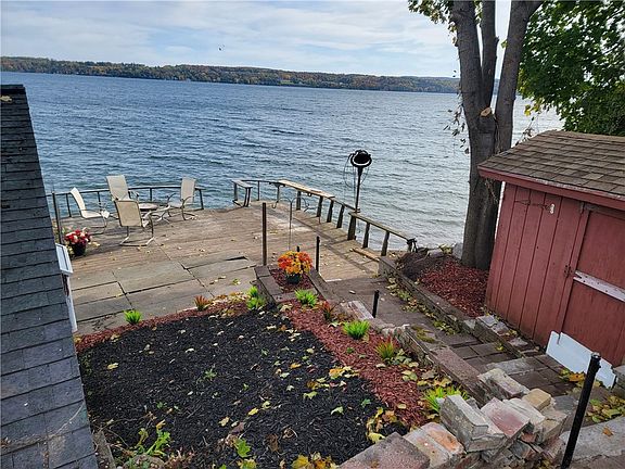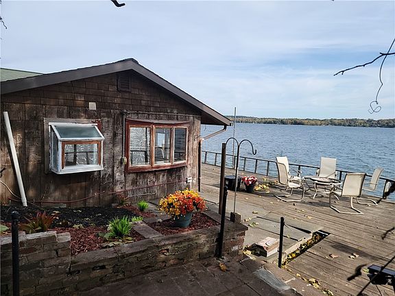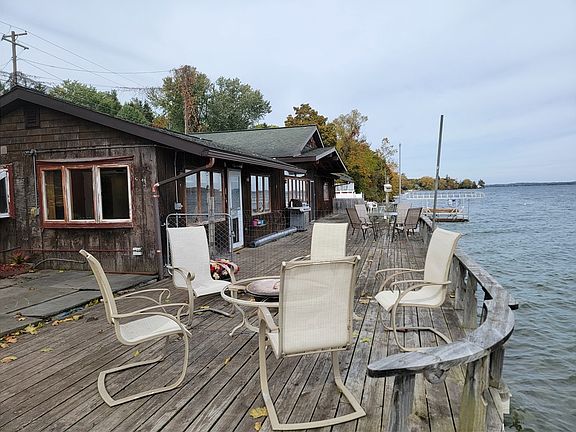 Nice 2 bed 2 full bath cottage with Huge deck right on Owasco Lake with master bedroom.Home has a 1 car detached garage across the street from the house. A shared drive for two other homes leads to the garage with a gigantic back yard for expansion. Zoning laws in the town make it quite possible to add additional living space either above the garage or build new.This home would be the ideal airbnb situation. Home used to have outside kitchen on deck, gas lines are still in place and ready for kitchen. With just a little TLC this home could be a great vacation getaway or HUGE MONEY MAKER!!!!