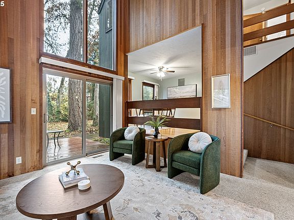 OPEN HOUSE Sunday 11/16 1-3pm. Mid-century warmth meets contemporary comfort in this beautiful South Eugene home. Soaring cedar-clad walls, vaulted ceilings, and large windows fill the living spaces with natural light. The multi-level open layout features four living and dining options for endless options plus a refreshed kitchen full of storage. Upstairs you will find three bedrooms that are cozy, full of storage and with a nice separation of space. The two and a half bathrooms blend newer, modern fixtures (including a jacuzzi tub) with vintage charm. Stay comfortable inside year round with newer HVAC, some new windows including slider to back deck and new blinds throughout. Step outside to the large, sunny, useable yard with a nice shed. This grassy property backs up to tree and a school campus. Nestled in a quiet street close to parks, schools and shopping-this home offers timeless design and everyday livability in one inviting package.