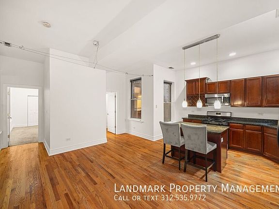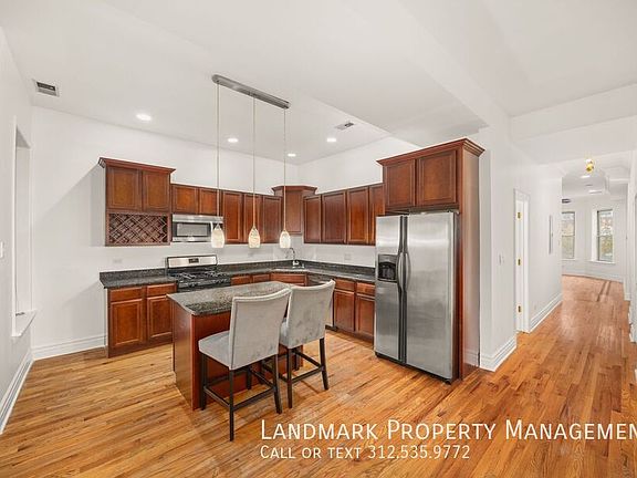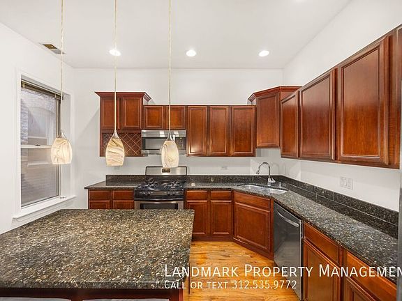 Welcome to your dream home in the heart of Chicago, IL! This stunning 3-bedroom, 2-bathroom residence is brimming with top-notch amenities. The kitchen is a chef's delight, boasting stainless steel appliances, granite counters, hardwood cabinets, and an eat-in area for cozy meals. The home features a mix of hardwood and carpet flooring, adding a touch of elegance and comfort. The living area is accentuated by large windows that flood the space with natural light, and a gas fireplace that adds a warm, inviting ambiance. The bathrooms are equipped with a soaking tub for ultimate relaxation. The unit also includes a laundry facility for your convenience. The property comes with a balcony, perfect for enjoying the city views. The home is equipped with central air conditioning and ceiling fans to keep you cool during the summer, and a furnace and electric water heater for the colder months. One parking spot is included, along with services like trash removal, water, and landscaping. Pet lovers will appreciate that both cats and dogs are welcome. Experience the perfect blend of luxury and convenience in this Chicago gem!