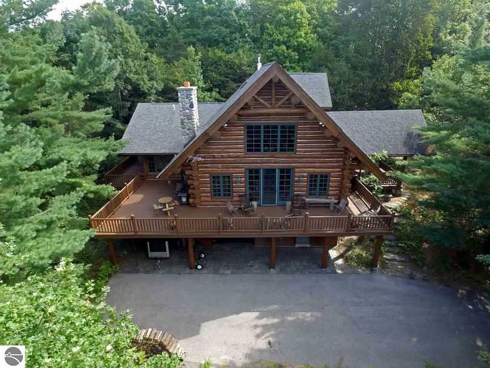 This magnificent Maple Island Log Home is nestled atop 7.64 acres of towering hardwood trees and welcomes you with stunning views of Lake Bellaire. An individually handcrafted masterpiece, it offers many custom artful details throughout. Not an ordinary log home, it must be seen to fully appreciate its unique qualities. The home offers a large living room with a masterful natural stone fireplace that rises to the vaulted ceilings. The spacious kitchen is equipped with Frigidaire Gallery appliances, granite counters, painted oak kitchen cabinets, a custom cut tile backsplash, and hand-painted sinks. It also includes a walk-in pantry and adjacent half bath and laundry. Hardwood flooring was used throughout the home. There is a main floor master bedroom, with ensuite bath, complete with tiled shower, claw foot tub, double sinks and heated slate floors. Just outside on the deck, you can relax in the hot tub, brand new in 2018. Upstairs there are two charming guest rooms, each with balcony access, a bath with granite counters, tile floor, linen closet, and double sinks. The spacious loft offers exceptional views of the lake. The youngsters will also enjoy the âsecretâ room tucked around the corner. The lower level is finished with a family room, a large bunk room that sleeps 8, and a bath featuring an antique vanity and sink, along with a large river rock tiled shower. Two garages are accessed on this level. One is deep enough to store a 19â boat and golf cart. Other premium features include 2 hot water heaters, forced air and wood-burning furnaces, security system, whole house Bose sound system, wraparound deck, and copper gutters. The home sleeps 16, is moments from Shanty Creek Resort amenities and includes access to the Beach Club on Lake Bellaire. Truly a home for the discerning buyer!