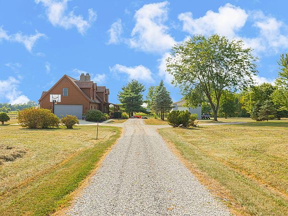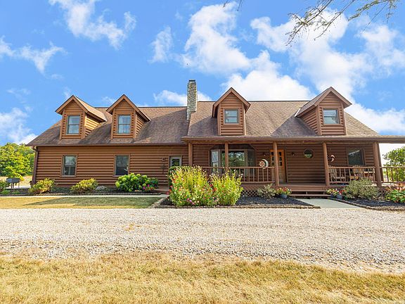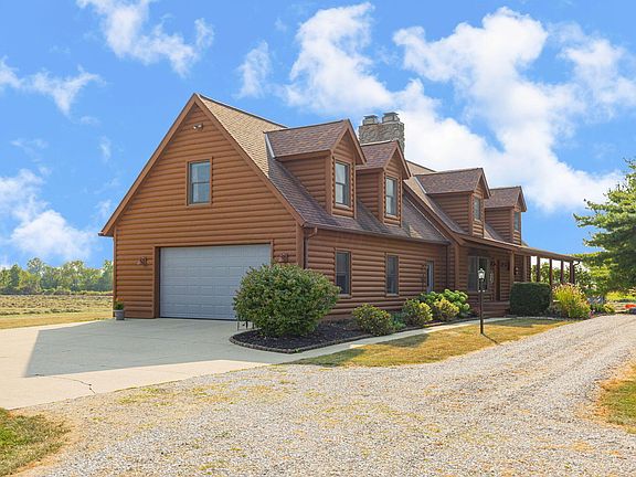 This stunning 4-bedroom (possible 5th), 2.5-bath log-sided home offers over 2,800 sq. ft. of living space plus an unfinished basement. Highlights include a stone fireplace reaching up to the loft, an oversized attached garage, and remodeled bathrooms and kitchen. The property features an auxiliary garage with a hoist, exhaust, storage, and roll-up door, plus a smaller garage near a 1.5-acre stocked pond with new roof, aerators, and surrounding woods. Recent updates: owner's suite, sump pump, roof shingles, furnace, A/C, and more. Includes gun safe, hot tub, and washer/dryer.