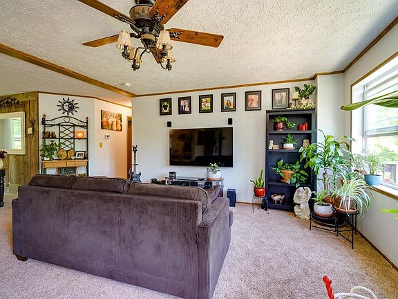 Desirable privacy offered by this 3 bedroom 2 full bath home on THREE ACRES! Spacious front living room showcases tons of natural light. Adjacent eat in kitchen with breakfast area. Primary bedroom offers an attached full bath. Two additional bedrooms plus a full hall bath. Ample storage offered by the shed, barn, and bonus cabin. Property has access to Brush Creek. MUST SEE!