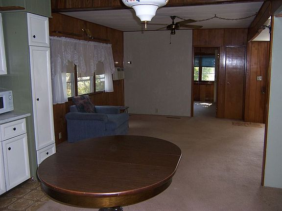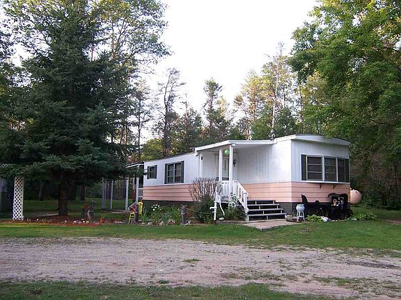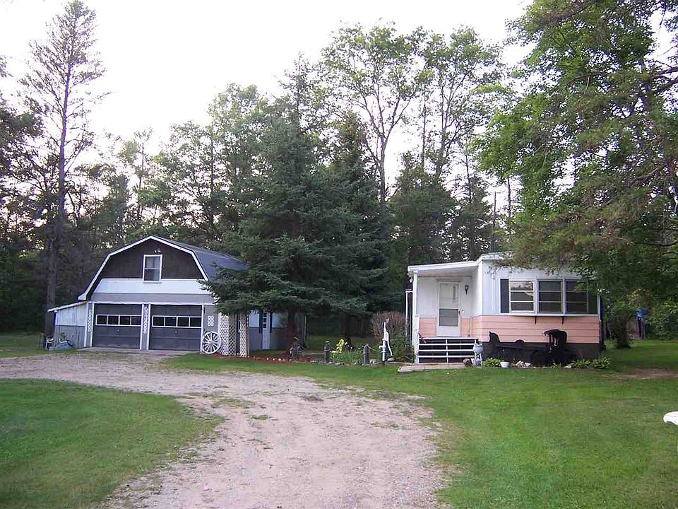 Mobile home in good condition - Large living room, gas heat, covered rear deck, wooded acreage with trails. New well in 2015. Large garage with workshop, wood stove and an upper level room for multiple uses.