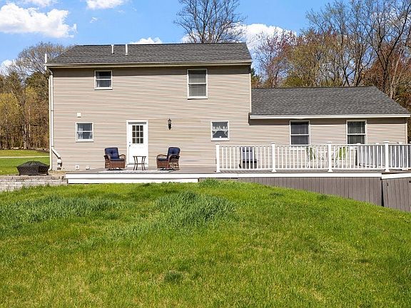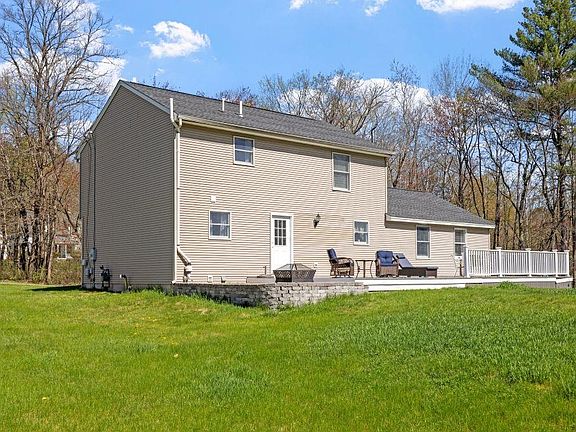 Welcome to this 4-bedroom colonial home which features a large kitchen with ceiling height white antiqued cabinets, granite countertops, and stainless steel appliances. The open great room has walnut floors, cathedral ceilings, custom built-in bookshelves, and a gas fireplace. There is a formal dining room with a shiplap accent wall. The first-floor primary suite has a bath, while the upstairs bedrooms include a custom walk-in closet. Two smaller rooms finished in basement for extra weight room, hobby room or just storage. Enjoy a new 20x40 composite deck and updated amenities like gutters, roof, energy-efficient natural gas boiler, well pump, water softener, and driveway. This home sits on 1.63 acres near major commuting routes. Its large level lush lawn offers small stream to front wooded area of home, shade trees along back yard and lots of entertaining space.