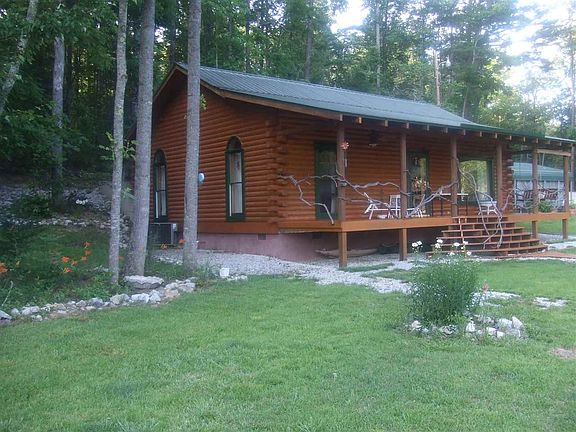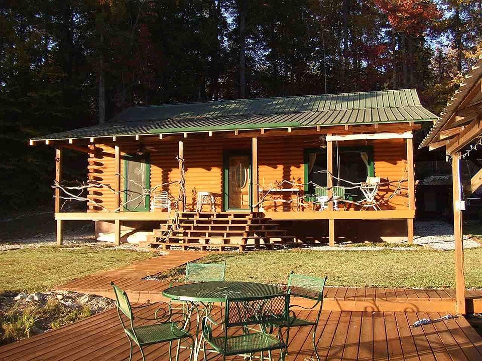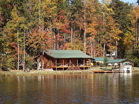 End of lake setting, two lots with over 190 feet on the lake. Easy slope from the dock to the house. A large front porch on the lake side leads you into the house. The log cabin has 2 bedrooms, 1 bath and a great room with stacked stone fireplace. Low maintenance home on large wooded lot.